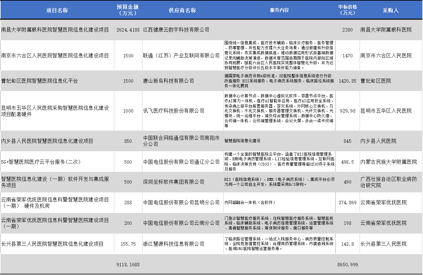 从项目金额看,市场投入理性且集中,头部项目引领作用明显。 本月统计项目总预算超过9100万元,最终中标金额约8650万元,整体资金执行率高达94.9%,显示出采购流程的规范与高效。其中,南昌大学附属眼科医院以2380万元的中标价位居榜首,南京六合区人民医院、曹妃甸区医院项目也均超过1400万元。这些千万元级的大型项目,往往意味着医院正在进行全局性、系统性的数字化升级,而非零敲碎打的补丁式建设。与此同时,我们也看到如长兴县第三人民医院等150万元级别的项目,这反映了不同层级、不同规模的医疗机构正根据自身需求与财力,分步投入到智慧化建设中,市场呈现梯队化发展态势。